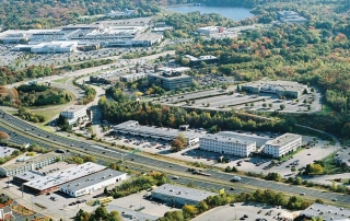 An existing one-story 34,000 sf building located off Route 93 in Braintree. The conceptual design for this project included creating two stories of running tracks, one located on the additional roof between the existing four-story buildings. The dynamic new entrance and ground floor level includes a generous concourse linking the three buildings.